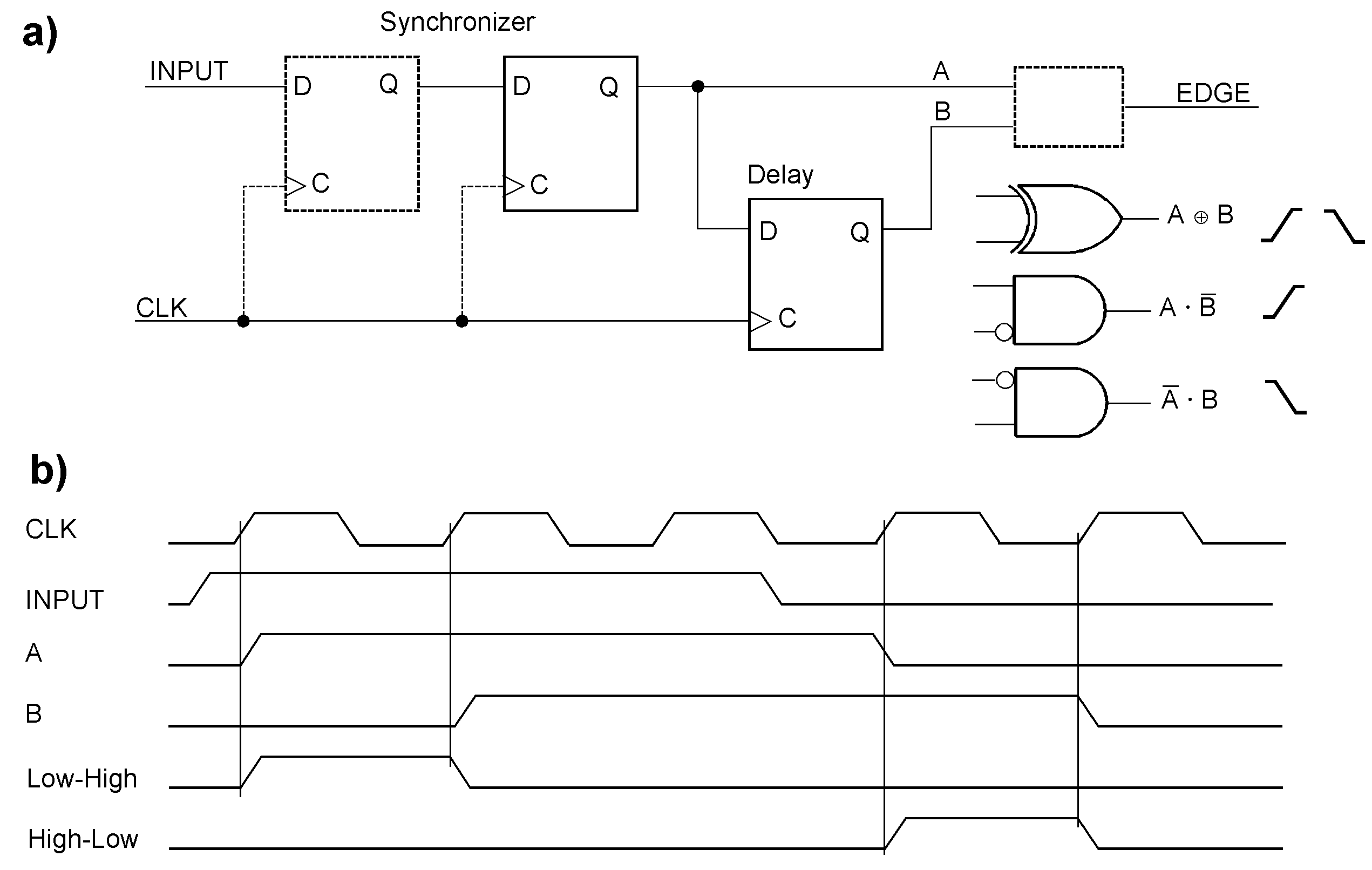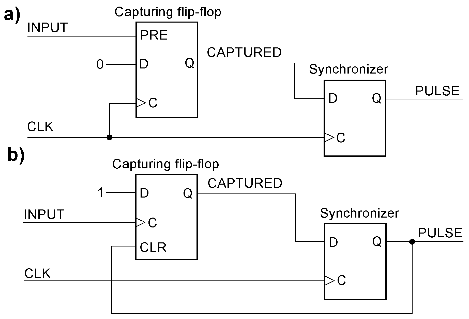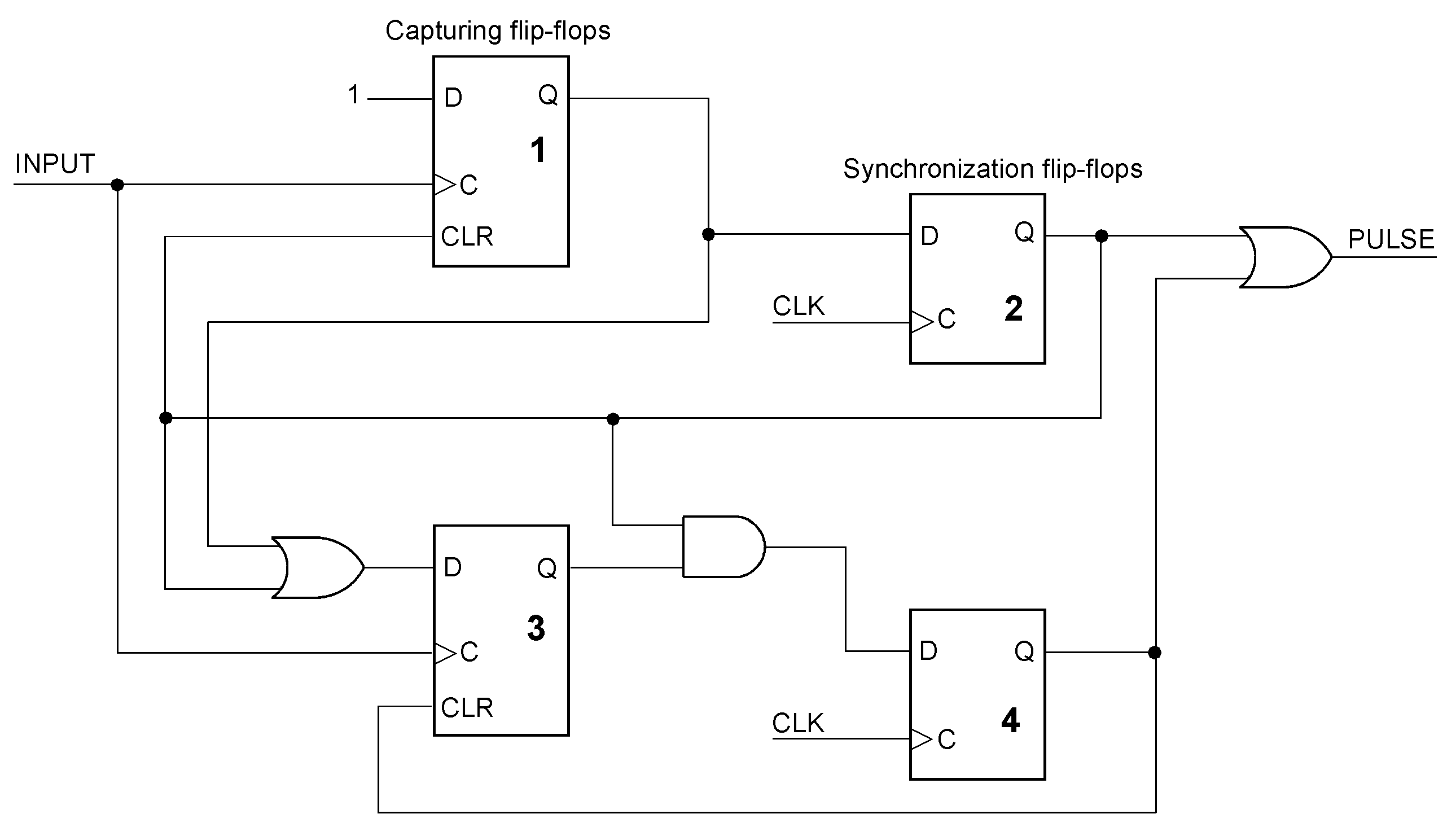 An edge detector circuit emits a pulse if the input level changes to the opposite (from Low to High or vice versa). Edges could be detected by connecting the signal to be observed to the clock inputs of edge-triggered flip-flops, as depicted in Figure 12. Those flip-flops, however, must be appropriately cleared to arm them again to capture the next edge.