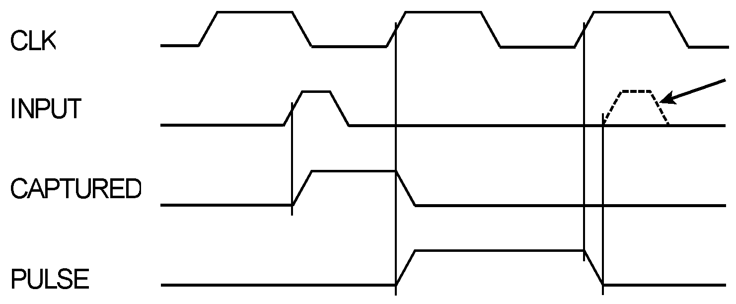 Sampling and synchronization are the first stage of capturing. No pulse will escape if we sample fast enough. The question is how wide the synchronized PULSE output signal should be. The width could be, for example, approximately equal to that of the input pulse. For this, the synchronizer alone suffices. If we want a synchronized pulse only one clock cycle wide, regardless of the input pulse width, we must connect the synchronizer to a single-shot generator.