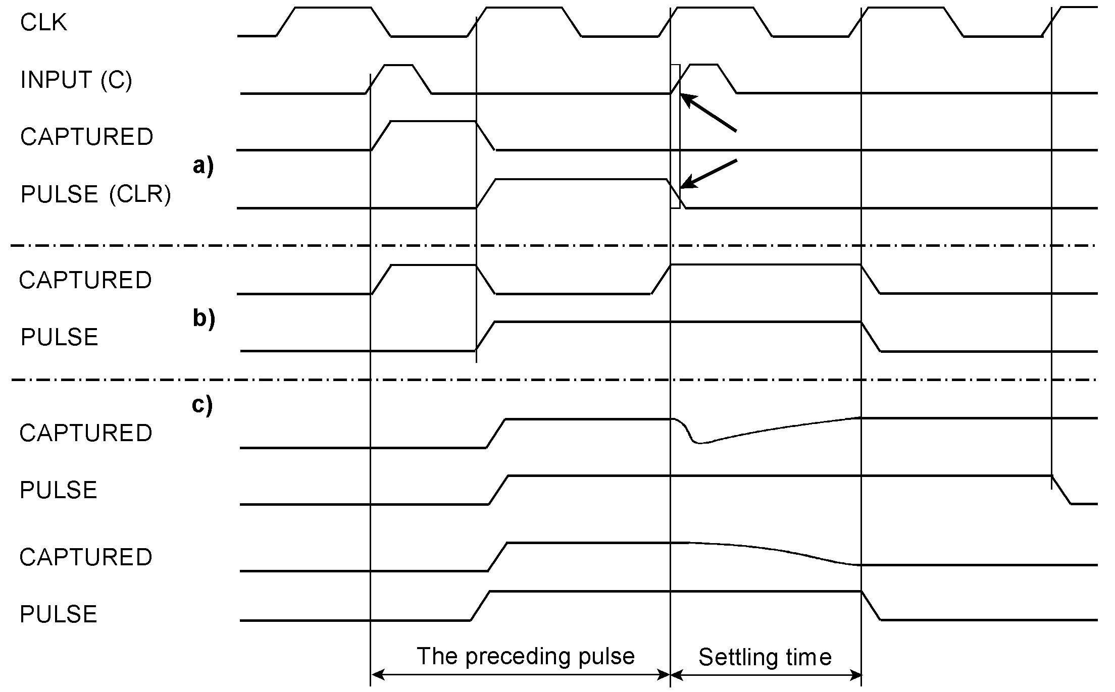 If CLR wins, the capturing flip-flop remains deasserted (a). If C wins (that is, the asynchronous pulse input), the capturing flip-flop will switch on again (b), causing the output to remain asserted during the next clock cycle. If there is no winner, the capturing flip-flop goes through a metastable state (c).