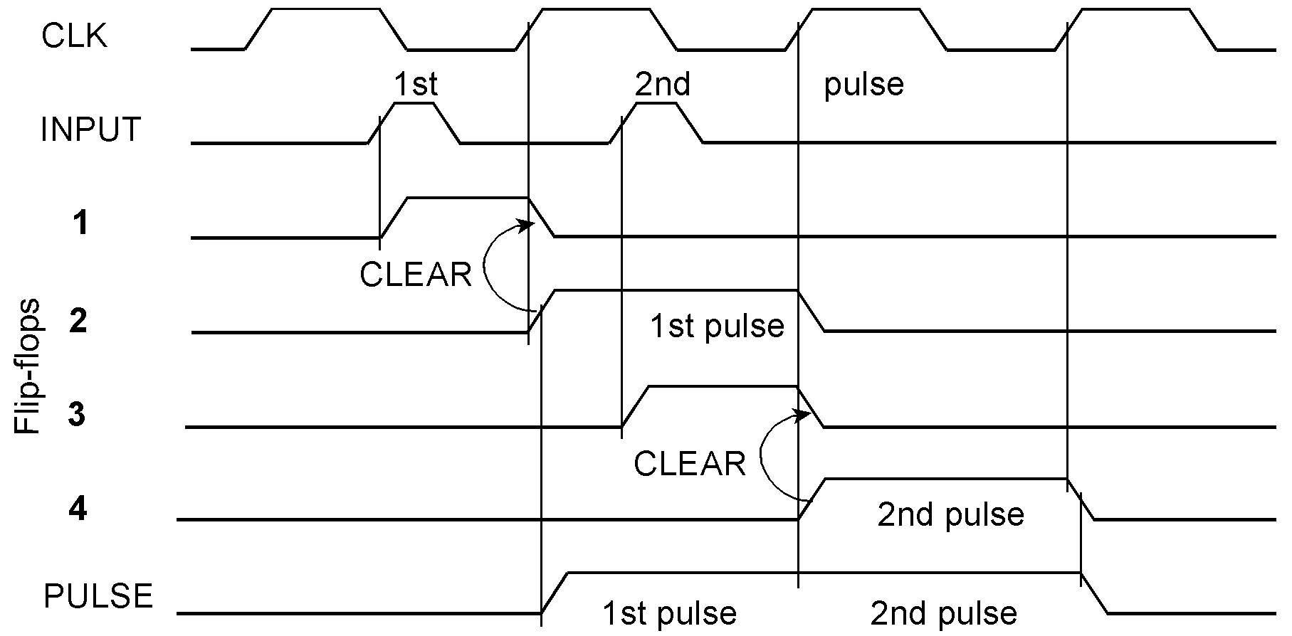 How to avoid the drawback, that the pulse arriving while the PULSE output is asserted will be lost? Here, two capturing flip-flops are employed. The second will take over while the first has memorized a pulse or is cleared. Two consecutive pulses are signaled by the PULSE output active for two clock cycles.
