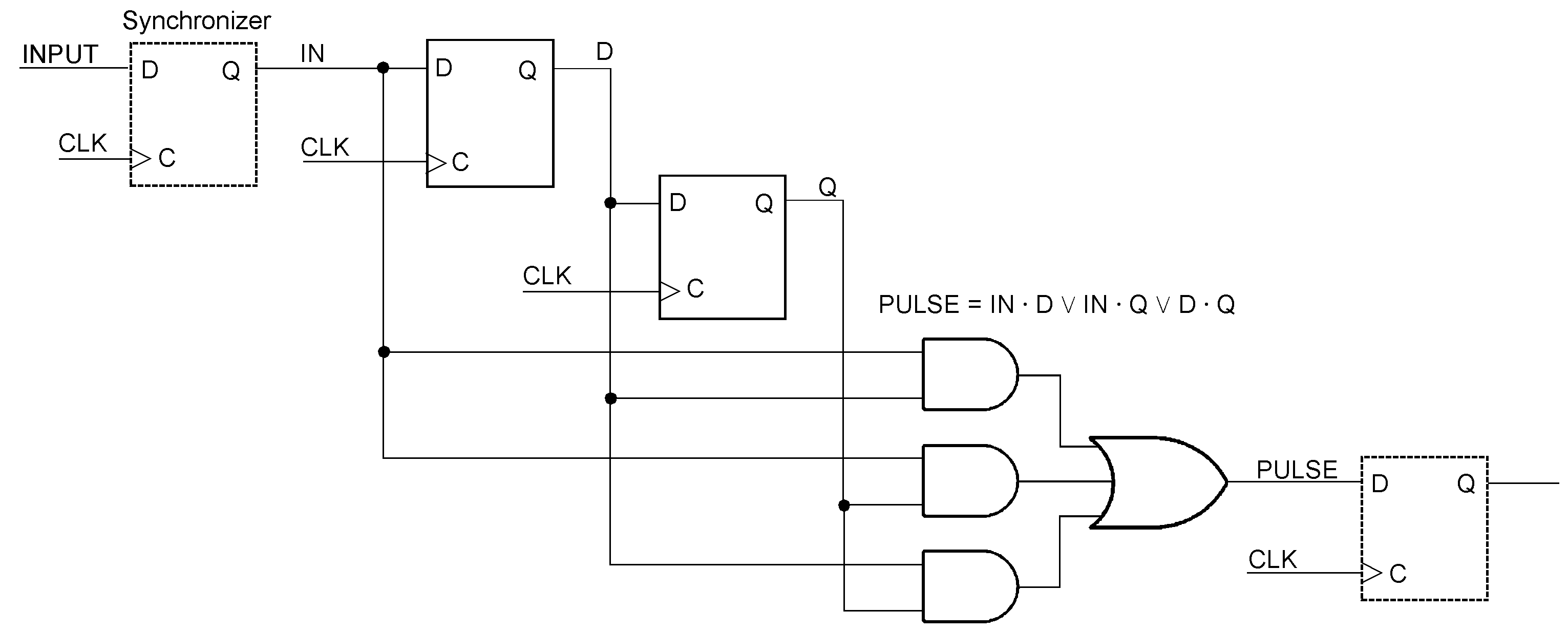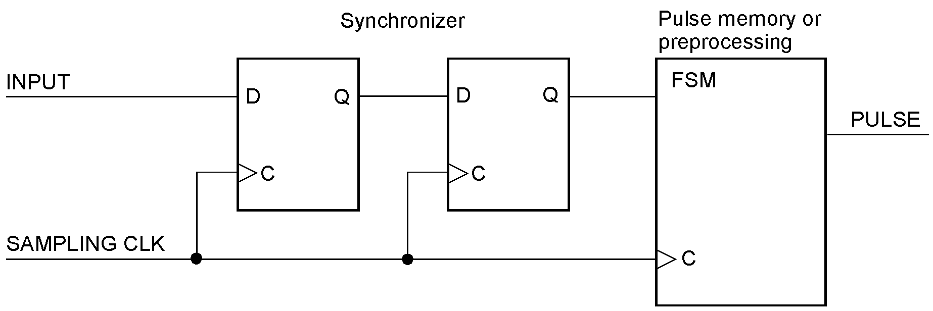 The arriving pulses are sampled and synchronized. Here, a two-stage synchronizer is shown. The application problem can be solved by state machine design as taught in the textbooks and supported by hardware description languages (HDLs) and integrated development systems.