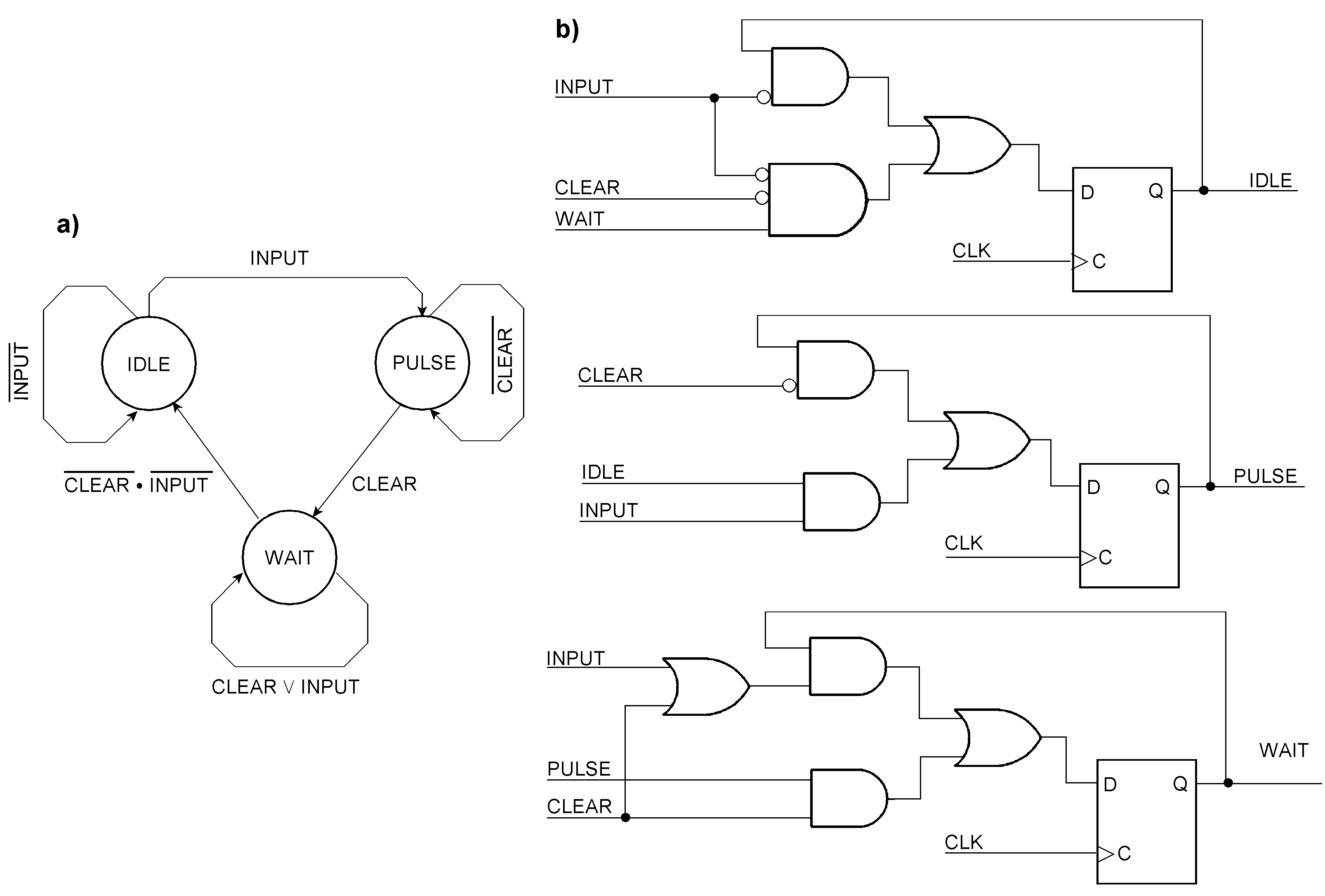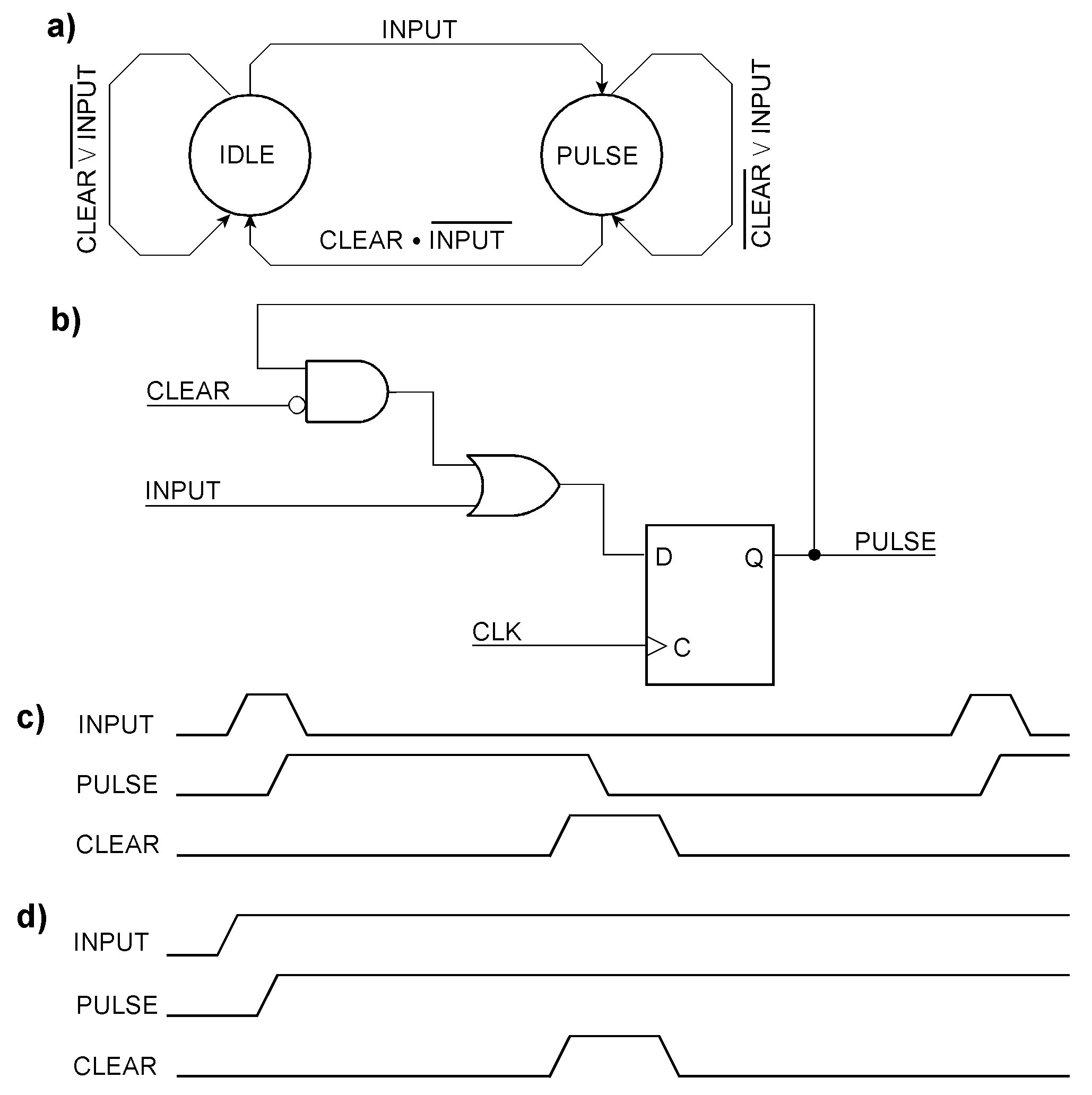 The most straightforward FSMs have only two states. When the arriving pulses and clearing of the pulse memory do not overlap, we can get by with an IDLE state, when nothing is to memorize, and a PULSE state, if the input has become active. When the input pulse has disappeared, the feedback will cause the PULSE state to be retained until CLEAR becomes active and disconnects the feedback. Thus, the pulse memory will fall back to its IDLE state. If, however, CLEAR is asserted while INPUT is active, the latter will take precedence, causing the FSM to remain in the PULSE state.