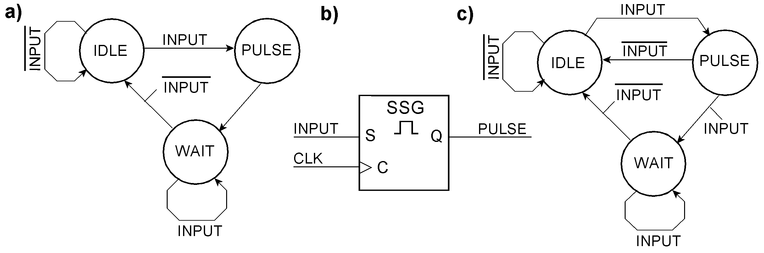 When an input pulse arrives, the single-shot generator emits an output pulse one clock cycle wide. Single-shot pulse generators could be dubbed digital monostable multivibrators, too. They can be designed as finite state machines(FSMs), their behavior described by state transition diagrams. Appropriate state machines must provide for wait states in which they wait for the input signal to become inactive.