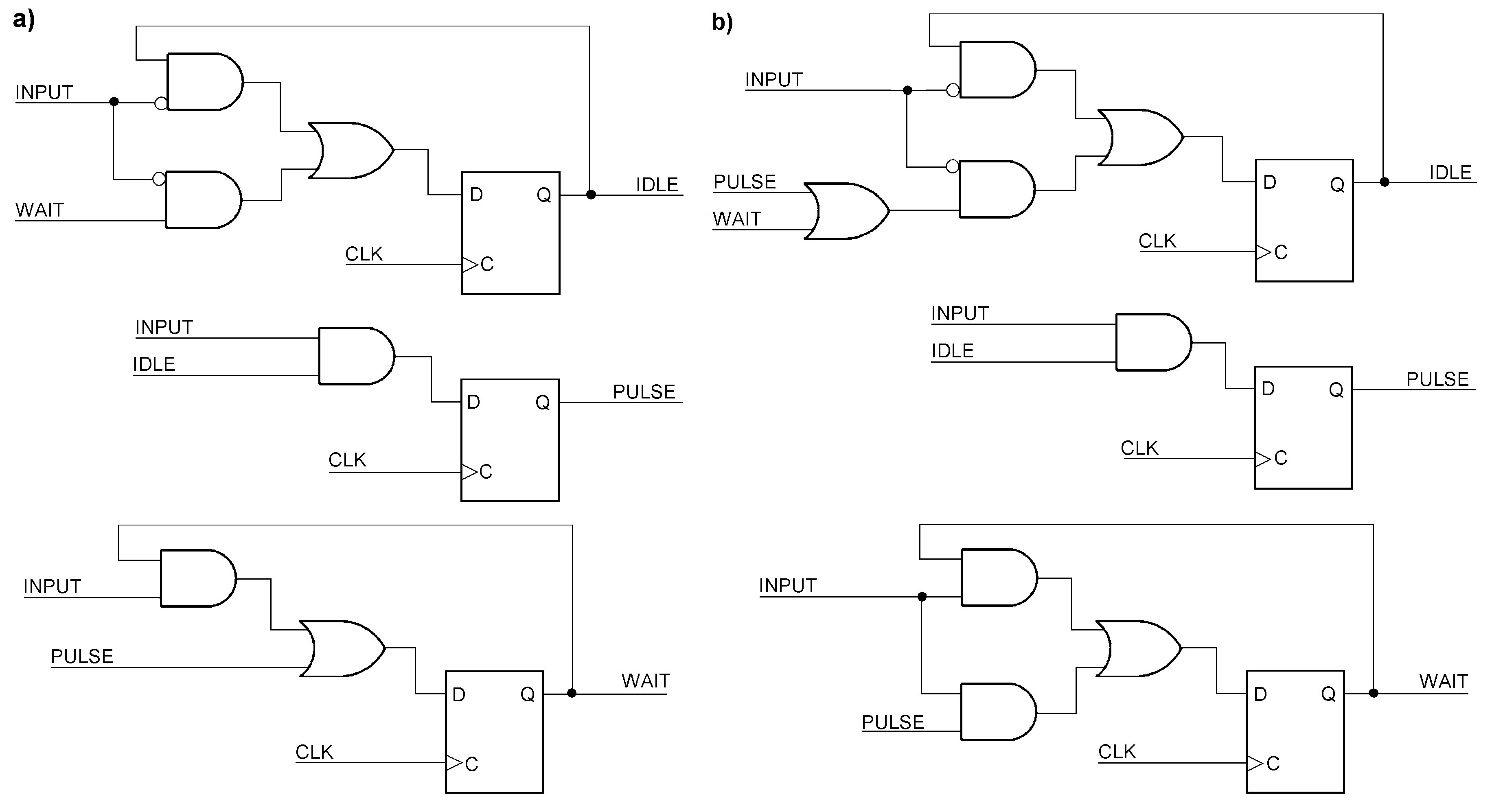 This synchronous pulse memory detects the pulse’s Low-to-High edge. It will accept a pulse only when both signals, INPUT and CLEAR, have been inactive together previously. For this, a third state has been added to wait for the said condition. The IDLE state will only be taken again after the input pulse and the CLEAR signal have both become inactive. Afterwards, the FSM is armed again to catch the next arriving pulse. CLEAR takes precedence over the pulse input. After the CLEAR signal has been deasserted, the circuit will wait until the pulse input becomes inactive (Low) too. a) state diagram; b) circuit example. The state encoding is one-hot enable (OHE). On power-on, IDLE must be set; PULSE and WAIT cleared.