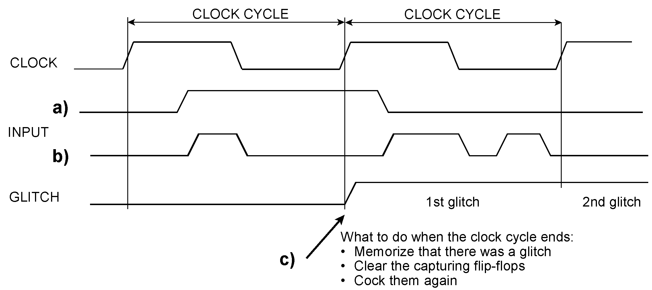 Detecting asynchronous glitches occurring within clock cycles. The input pulse (a) shows only one edge in each clock cycle. Hence, it is not a glitch. In contrast, the pulse train (b) carries glitches during two adjacent clock cycles. The arrow (c) points to the end of a clock cycle and the beginning of the next. In this moment, the stipulated activities of meorizing, clearing, and cocking again are to be carried out.