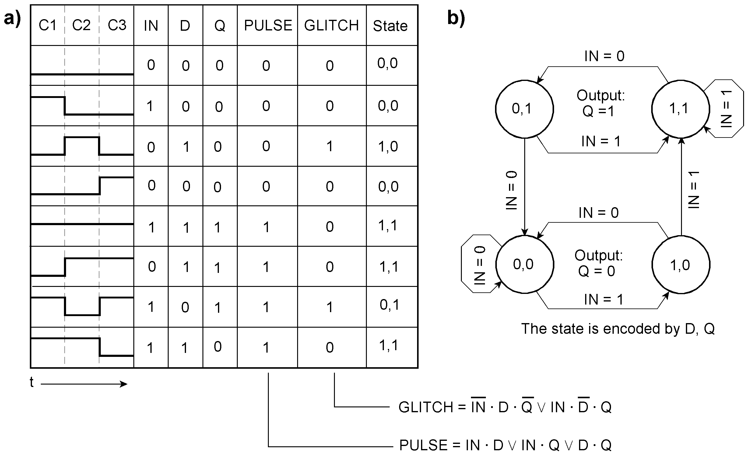Synchronous glitch filtering and detection (based on [A4]). a) truth table, b) state diagram of the glitch filter’s finite state machine (FSM). The Boolean equations relate to the glitch filter and the glitch detector circuits shown below.