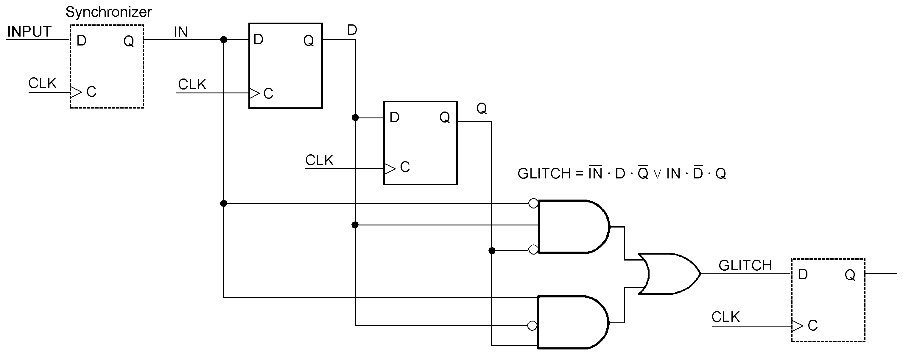 The following circuits are based on principles of synchronous operation to suppress or detect glitches. Essentially, they are finite state machines (FSMs). Hence, their operation can be described by state transition diagrams.