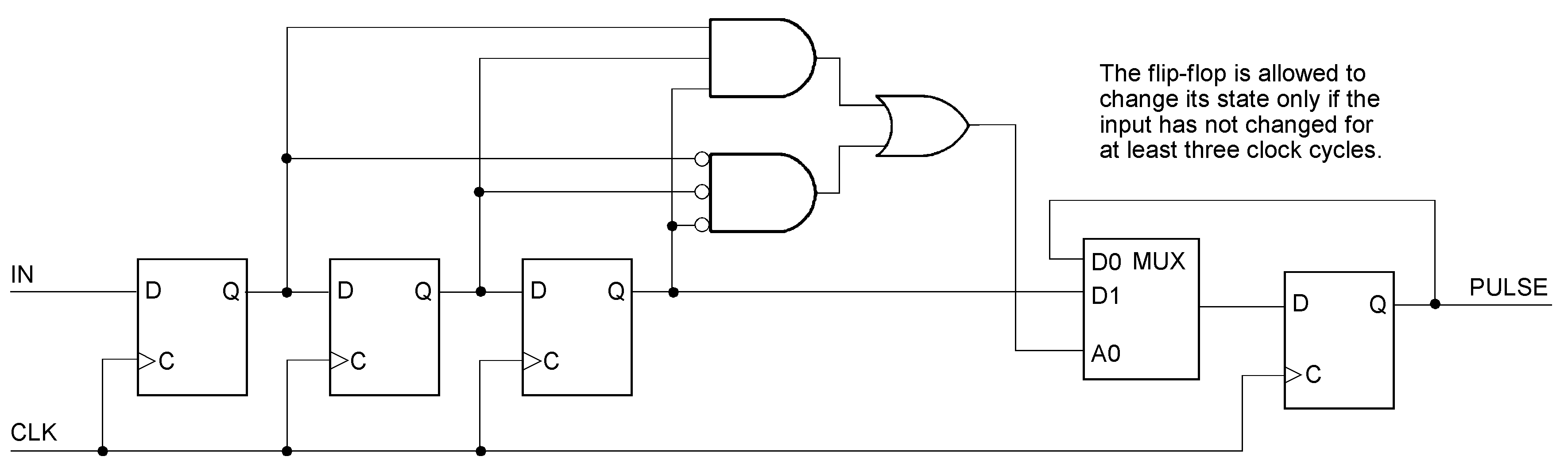 Another glitch filter or de-glitching circuit shows an obvious, easy-to-understand principle of operation. The glitch filter consists of a shift register, a combinational circuit detecting particular bit patterns, and an output flip-flop. The pulse train is fed into the shift register. The output flip-flop may change its state only if the shift register contains three ones or zeros, thus suppressing all other bit patterns mentioned in zhe truth table above. The shift register’s output is then memorized in the output flip-flop.It is also obvious that it could be used to suppress wider glitches by simply making the shift register longer and the AND gates wider.