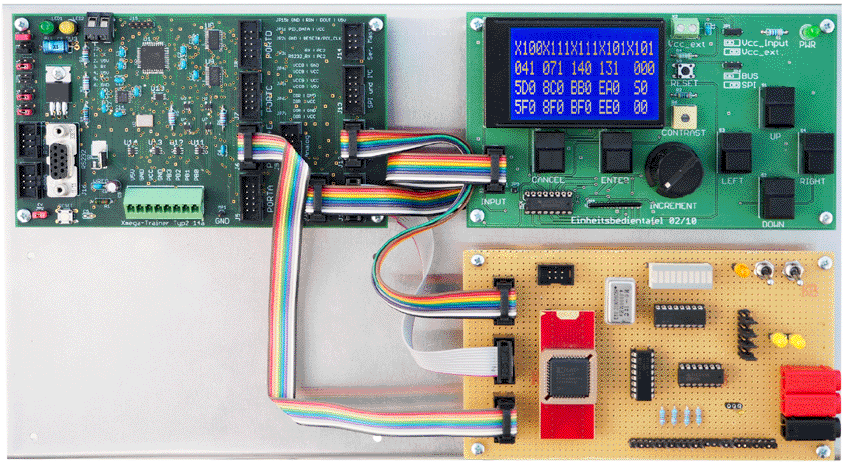 The microcontroller module generates the input signals, does a first (simplified) evaluation of the count values and supports the communication with an attached personal computer. The prototyping board carries the comparators and a CPLD containing the counters. The human interface module displays raw data and provides for tinkering without the personal computer.