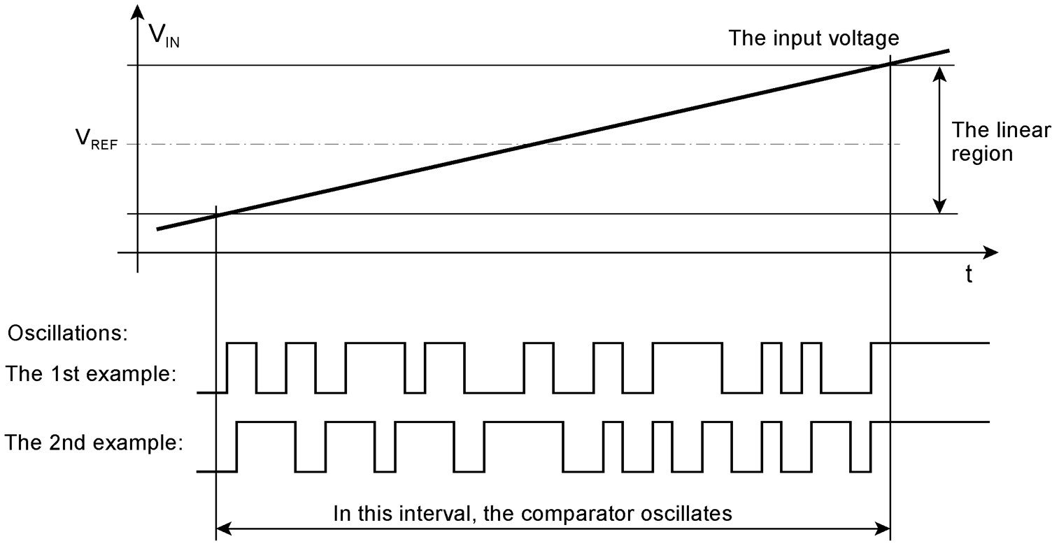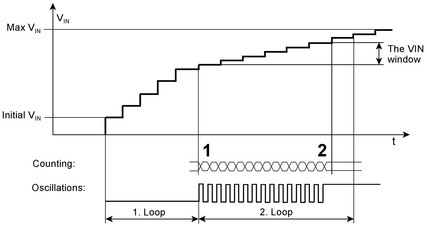 Each comparator has, depending on its reference voltage, a region of the input voltage in which oscillations will occur if traversed not too fast. This so-called VIN window is defined by a lower and an upper VIN limit. It is reached and traversed in steps.