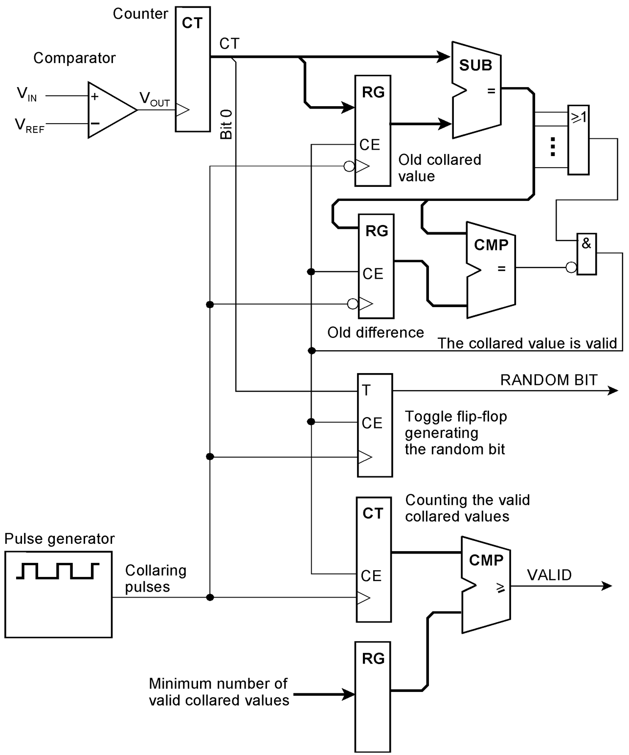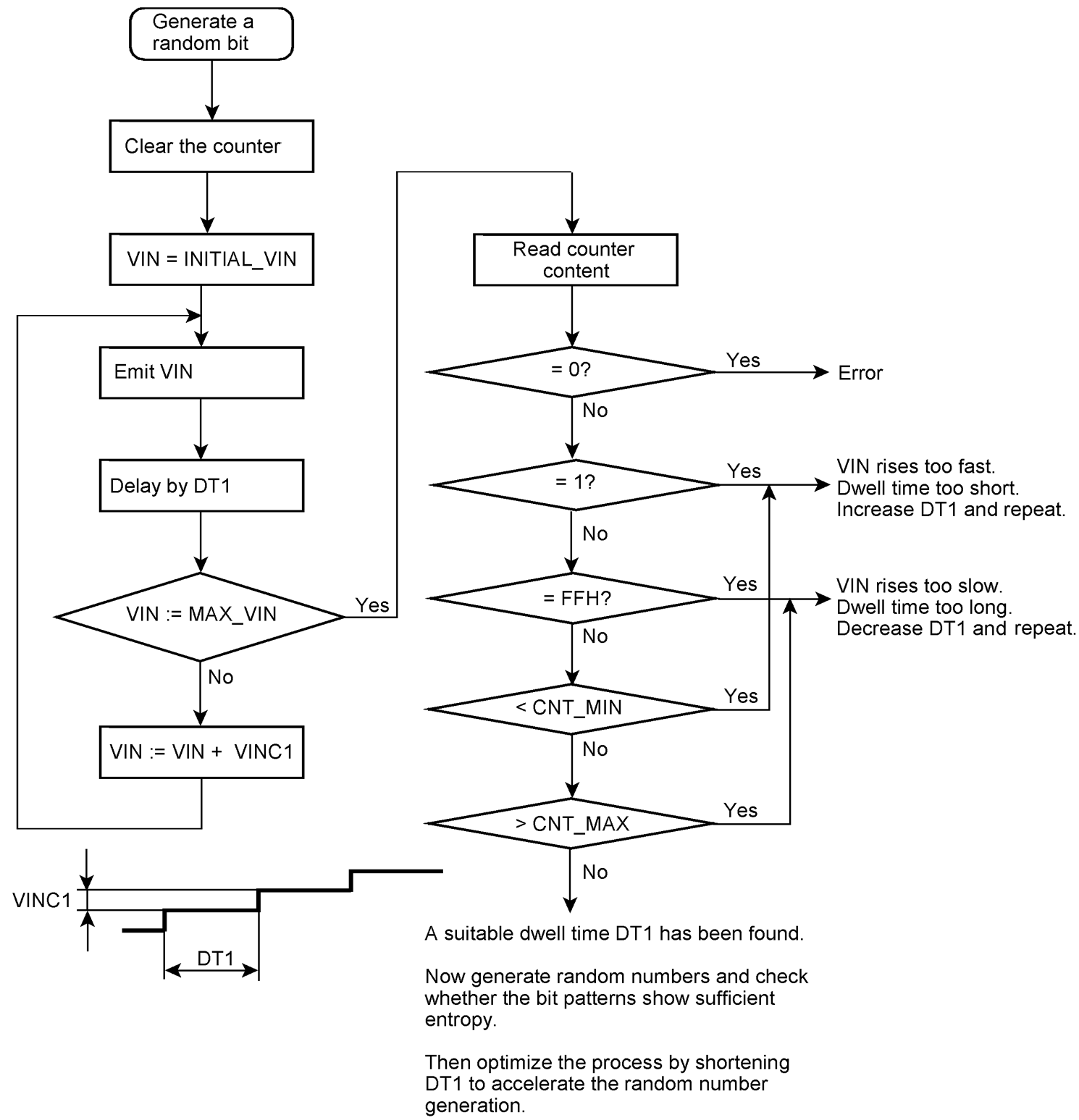 The most important parameter is the slew rate or, in other words, the dwell time in the VIN window. To secure sufficient entropy, a somewhat larger number of oscillations should be counted. On the other hand, it should not take too long to obtain a random bit. It was an intuitive decision to provide an 8-bit counter. The CNT_MIN and CNT_MAX values are parameters to be entered manually. As a starting point, we may, for example, stipulate more than 32 oscillations but no more than 128.