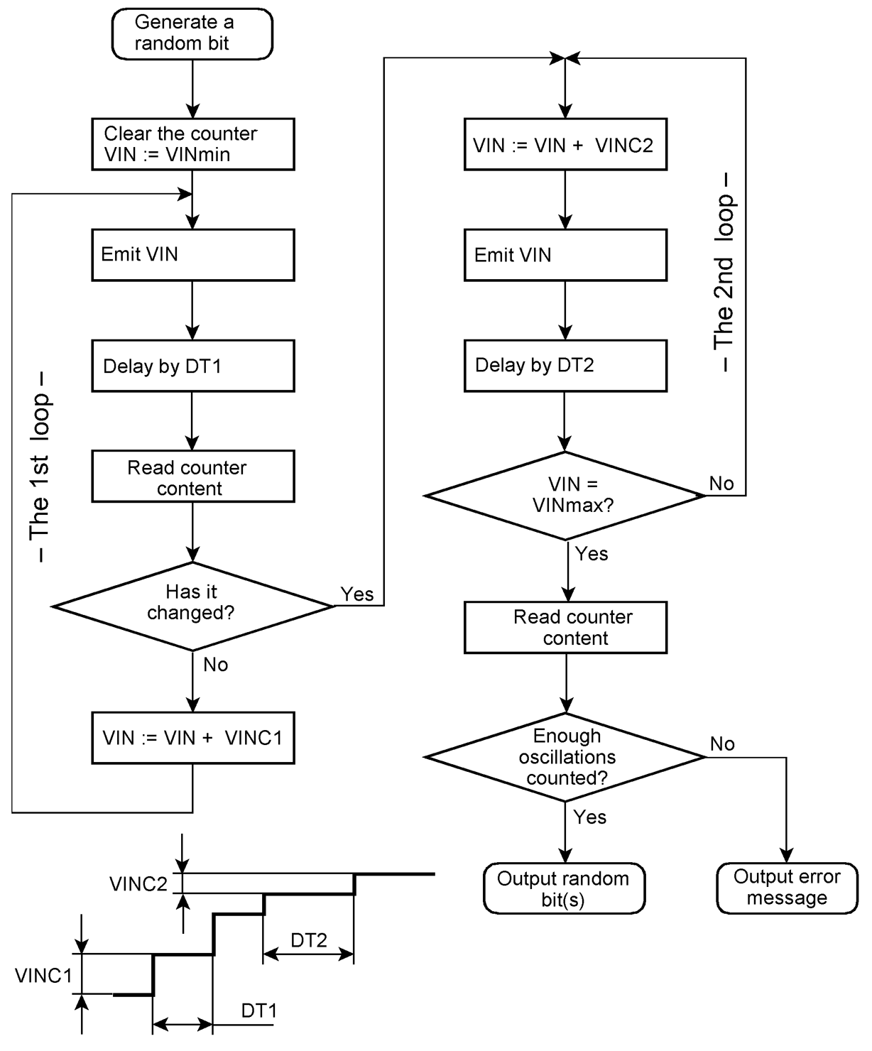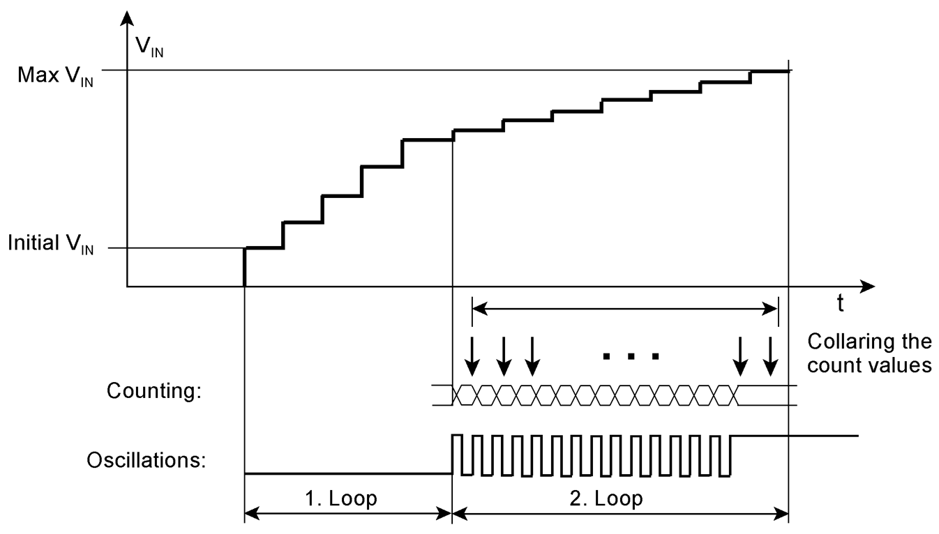 In a first loop, the software begins to emit somewhat coarse input voltage steps. In each step, the content of the counter is read. When its value has been changed, the linear region has been reached where the oscillations begin. Then the second loop will traverse the linear region in fine steps. The count values are collared. The second loop ends when the counter content changes no more.