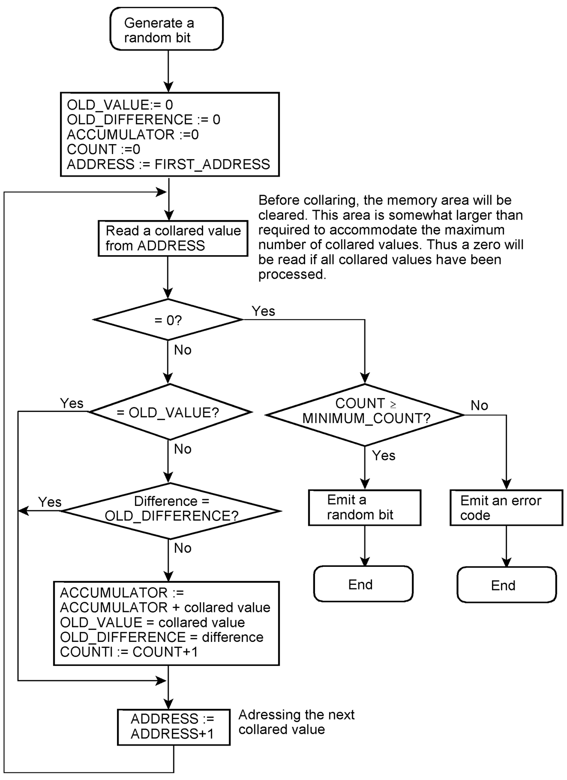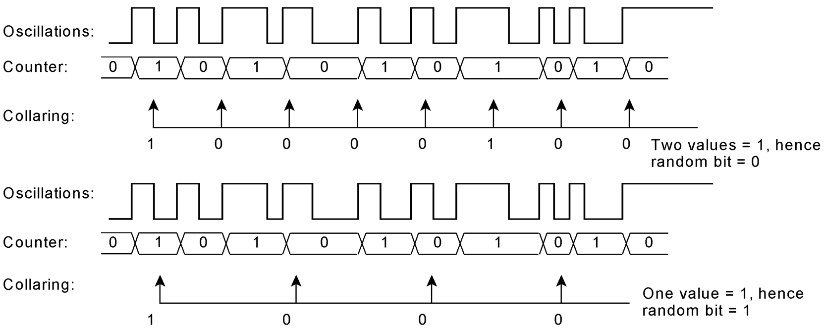The entropy is extracted by sampling and evaluating count values. The process of sampling is called collaring because we do not want to reproduce the signal faithfully but to extract randomness.