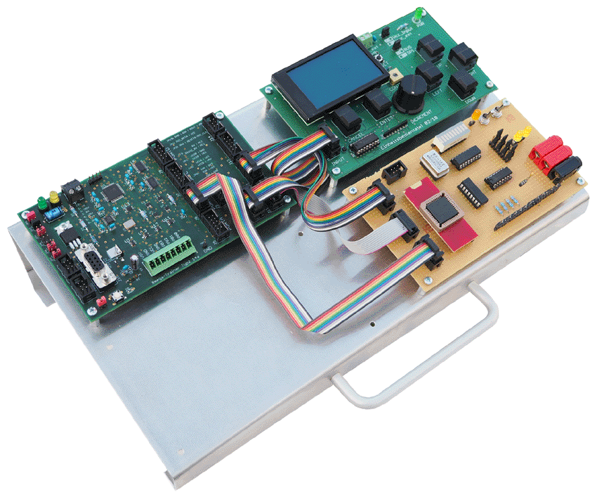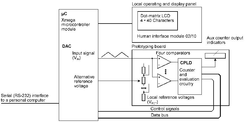 The experimental setup consists of four comparator-counter circuits. The counter contents are read out via an 8-bit data bus: