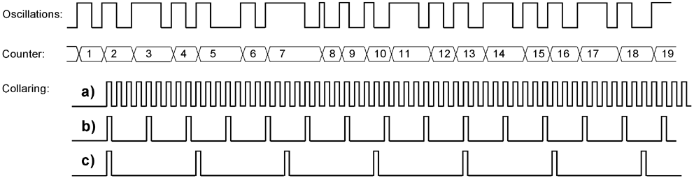 This pulse diagram illustrates how oscillations are counted and counter values collared. a), b), c) show collaring pulses at different intervals.