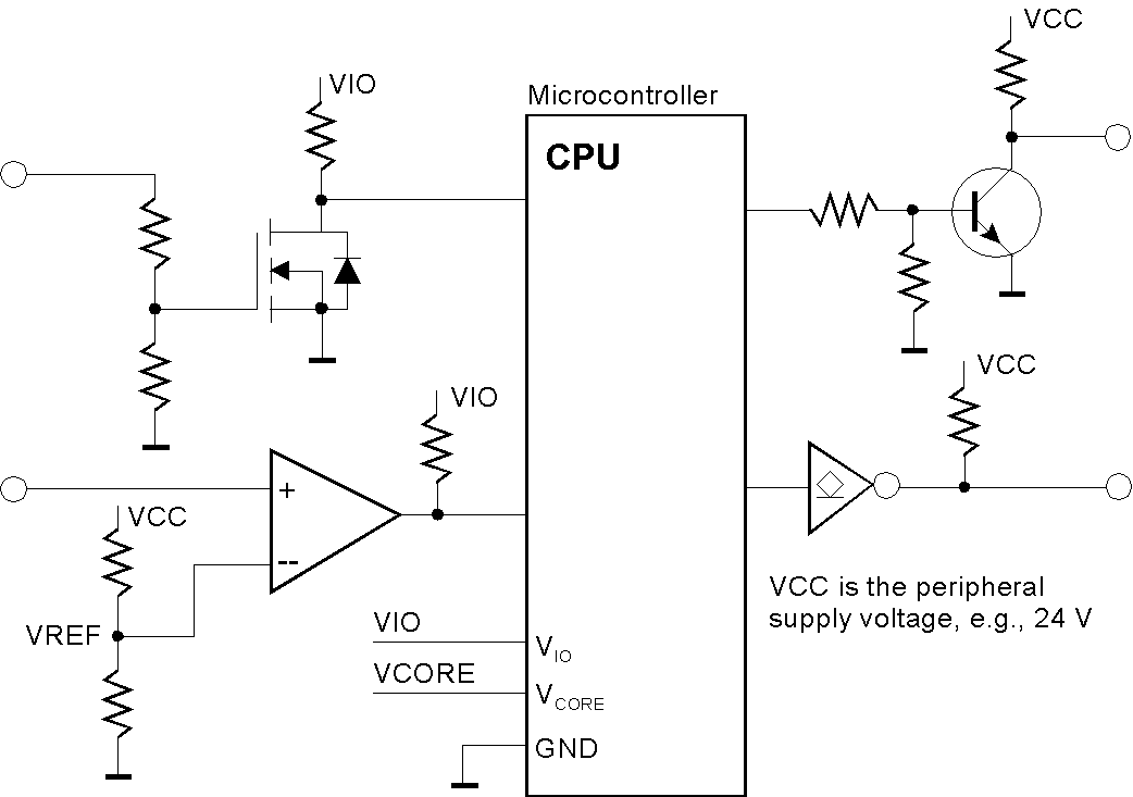 Level translation problems can be solved with discrete or SSI components, such as Zener diodes, bipolar junction transistors (BJTs), field-effect transistors (FETs), and comparators. Zener diodes and MOSFETs are well-suited to translate 24-V to logic signals (down to 3.3 V or below). BJTs and comparators may be employed in both directions.