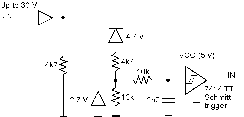The 4.7-V Zener begins to conduct if the input voltage exceeds approx. 5 V, thus guaranteeing a LOW level as long as the input voltage is less than 5 V. The 2.7-V Zener limits the input voltage of the 7414 Schmitt trigger. The 10k/2n2 combo acts as a low-pass or de-glitching filter.