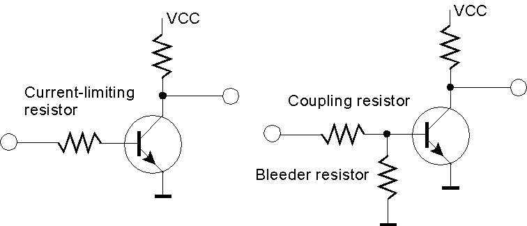 The two most basic circuits. Some manufacturers offer transistors with a built-in current-limiting resistor or coupling/bleeder resistor combo ([38]).