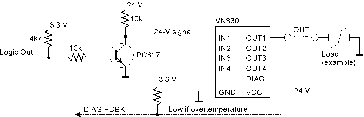 An application circuit translating 3.3-V signals to 24 V ([37]). The pull-up resistor keeps the transistor switched ON when the input is floating. Consequently, the VN330 will not energize the attached load.