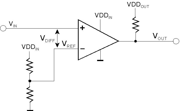The most basic circuit. The comparator's supply voltage VDDin corresponds to the input signal level.