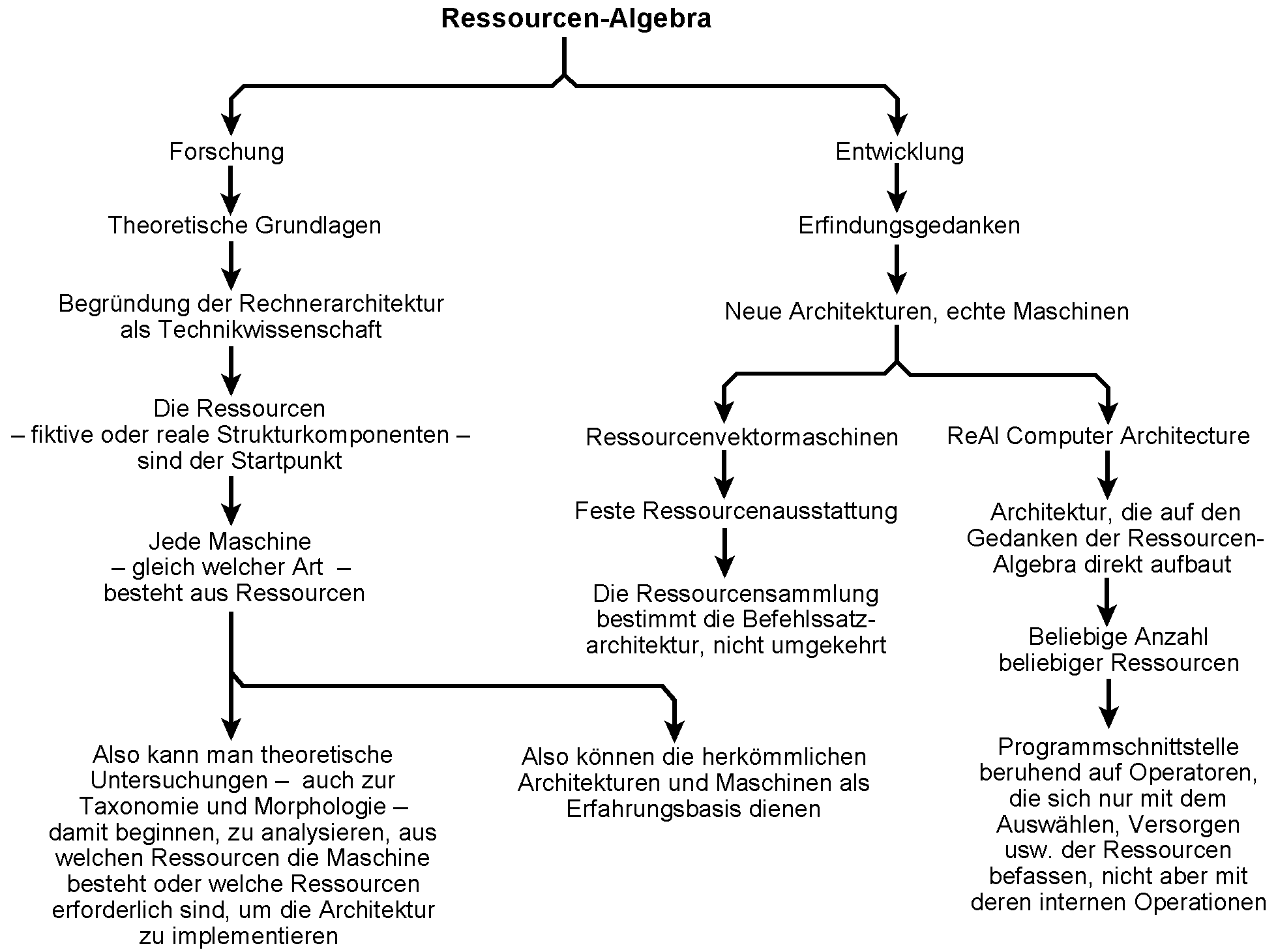 Rechnerarchitektur (Computer Architecture) ist die Lehre von den Schnittstellen zwischen Hardware und Software; mit anderen Worten, von Aufbau und Wirkungsweise des Computers aus Sicht des Programmierers. Die Rechnerarchitektur ist keine exakte Wissenschaft. Das Buch betrifft einen Versuch, diesen Entwicklungsstand zu überwinden. Das eine Ziel ist, die Rechnerarchitektur als wohlbegründete Technikwissenschaft aufzubauen, zumindest aber wissenschaftliche Begründungen für Architekturentscheidungen zu finden. Das andere sind Maschinen, die beliebige Programme ausführen können. Architekturen werden herkömmlicherweise von der Anwendungsprogrammschnittstelle (Application Programming Interface, API) her entwickelt. Wir hingegen beginnen mit den Funktionseinheiten der Hardware, den Ressourcen. Die Ressourcen bestimmen die Architektur, nicht umgekehrt. Jede Maschine läßt sich als eine Sammlung von Ressourcen auffassen. Beschreibt man sie formal mit den Ausdrucksmitteln der Mathematik, ergeben sich algebraische Strukturen. Somit liegt es nahe, die Architekturprinzipien mit dem Begriff der Ressourcen-Algebra zu bezeichnen. Architekturgedanken und Schaltungslösungen werden soweit beschrieben, wie es erforderlich ist, um die Wirkprinzipien darzulegen und zu zeigen, daß sich auf diese Weise tatsächlich universelle Maschinen bauen lassen. Um diese Gedanken abzusichern, werden sowohl der herkömmliche Universalrechner als auch Architekturen, die auf der Ressourcen-Algebra beruhen, auf mehreren Wegen begründet und hergeleitet. Abschließend werden Leistungsmaße und Bewertungskriterien vorgestellt.