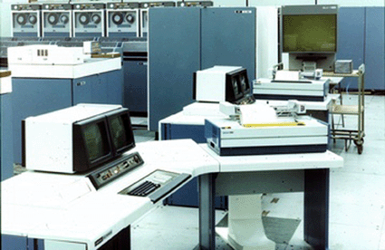 Mit Schaltnetzteilen in steckbaren Kassetten (oben) ergibt sich eine annehmbare Größe. Gesonderter Stromversorgungsschrank unnötig. Einschaltsteuerung (unten) vergleichsweise aufwendig, weil die Maschine in die Stromversorgungssteuerung des Mainframe-Systems eingebunden ist (zentrales oder lokales Ein- und Ausschalten des Gerätes, Ein- und Ausschalten des Systems, zentrales Not-Aus).
