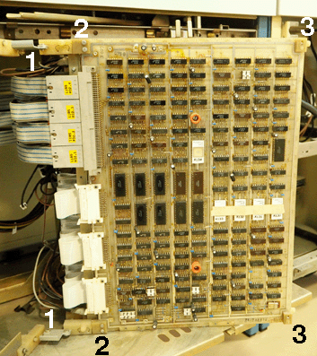 1 - Scharnier, 2 - Halterung; 3 - Arretierung. Arretierungen 3 lösen und Platine aufschwenken, so daß sie freikommt. Steckverbinder abziehen, und zwar einschließlich Stromversorgung (s. weiter unten). Dann Halterungen 2 lösen und Platine herausziehen. Beim Einbau alles umgekehrt...