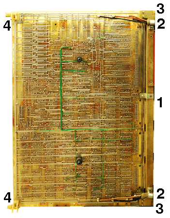 1 - Strebe, 2 - Zugentlastung der Stromversorgungskabel, 3 - die Halterungen (zum Einrasten in den Schwenkmechanismus) befinden sich auf der Bestückungsseite, 4 - Arretierungen (verbinden die Leiterplatten miteinander). Die Strebe 1 ist fest mit der Leiterplatte verbunden (Schutz gegen übermäßiges Durchbiegen, Halterung der Stromversorgungskabel).