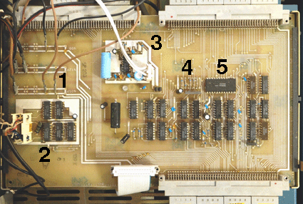 1 - Stromversorgungsanschlüsse, 2 - Monitoranschluß mit Crossover-Steuerung, 3 - NF-Verstärker und Lautsprecheranschluß; 4 und 5 - Digital-Analog-Wandler zur Lautstärkeeinstellung und Musik- oder Sprachausgabe (brauchbare Wavetables / Phoneme vorausgesetzt). 4 - geschaltete Widerstände; 5 - Ausgaberegister