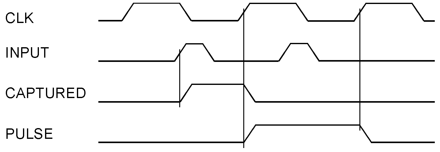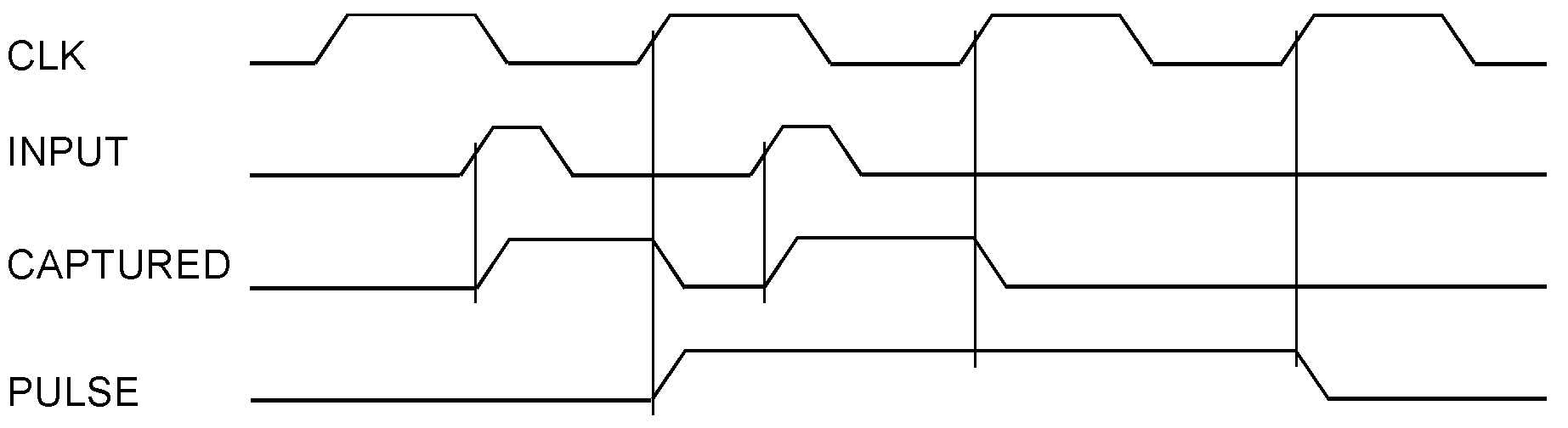 Sampling and synchronization are the first stage of capturing. No pulse will escape if we sample fast enough. The question is how wide the synchronized PULSE output signal should be. The width could be, for example, approximately equal to that of the input pulse. For this, the synchronizer alone suffices. If we want a synchronized pulse only one clock cycle wide, regardless of the input pulse width, we must connect the synchronizer to a single-shot generator.