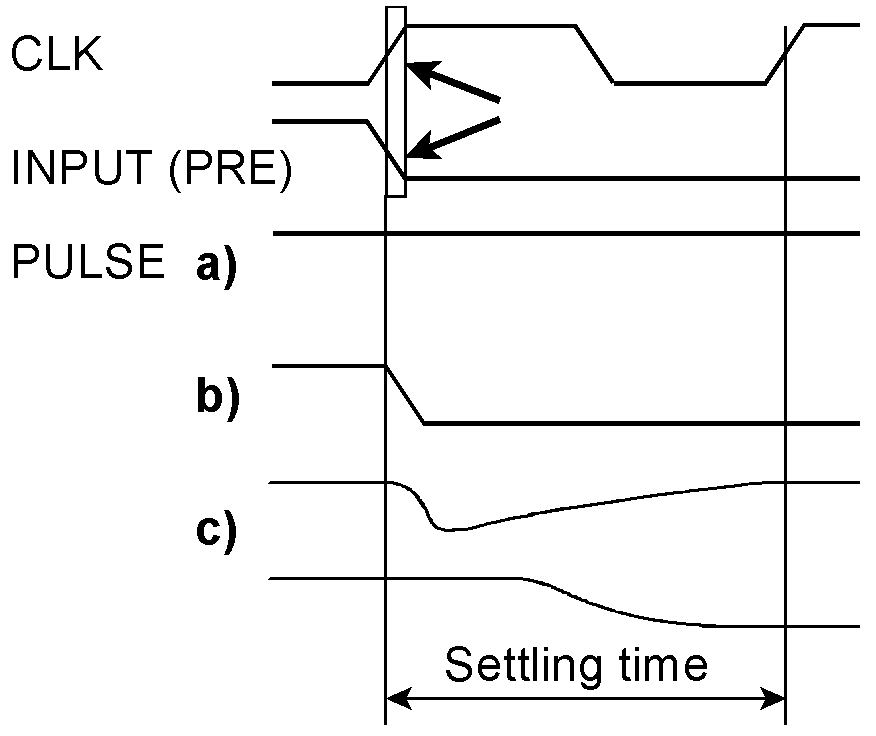 Metastability problems (1). The coincidence of edges that the arrows point to may occur when the asynchronous input is connected to the PRE (preset) input of the capturing flip-flop. A metastability problem could only occur if the clock goes active while the input becomes inactive . Then, the input may win (that is, the flip-flop sees PRE still as active during the clock edge and hence does not memorize the Low at the D input). Thus, the output remains asserted (a). Alternatively, the clock may win and the output becomes deasserted (b), or there is no winner and the flip-flop goes through a metastable state (c).