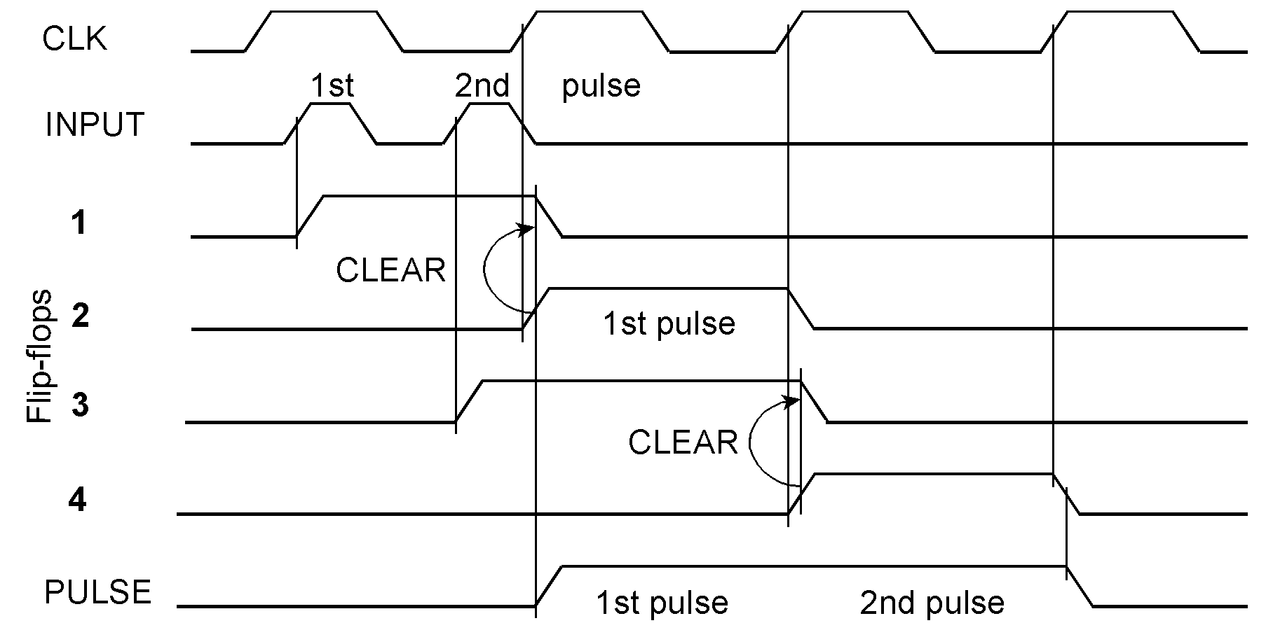 How to avoid the drawback, that the pulse arriving while the PULSE output is asserted will be lost? Here, two capturing flip-flops are employed. The second will take over while the first has memorized a pulse or is cleared. Two consecutive pulses are signaled by the PULSE output active for two clock cycles.
