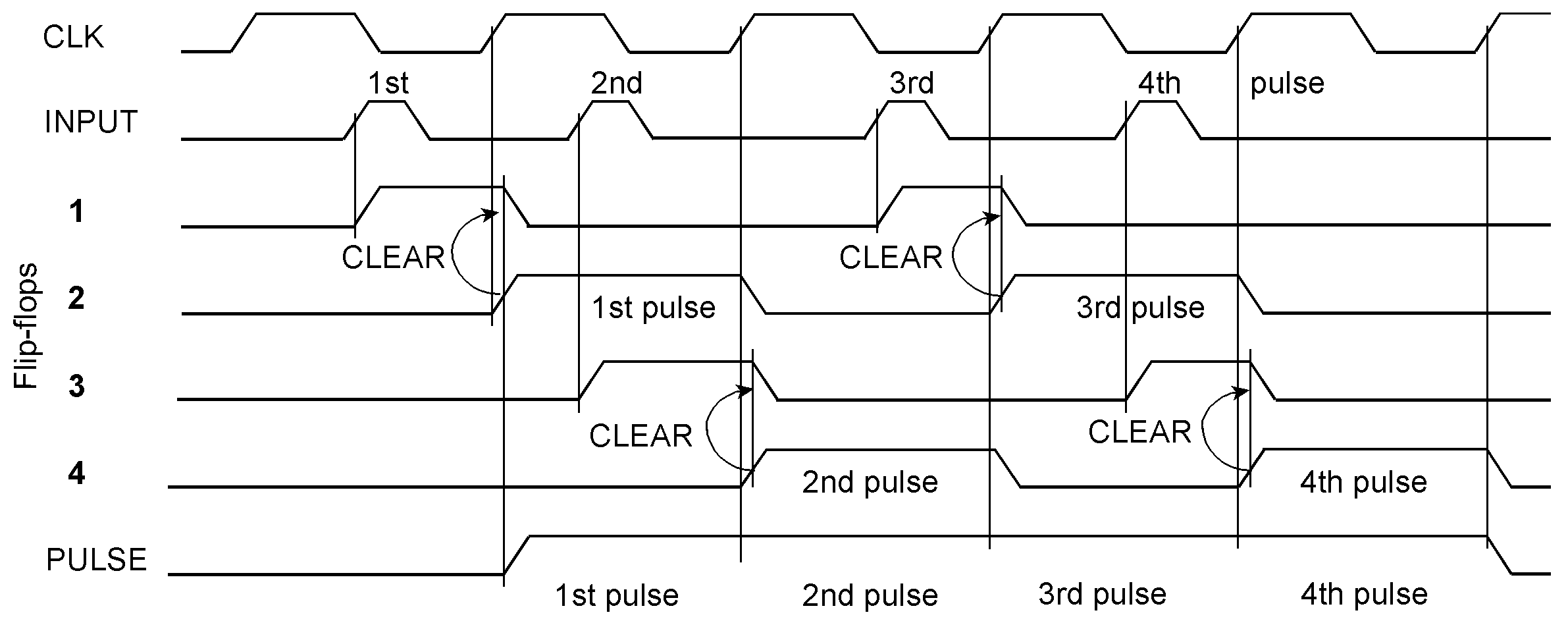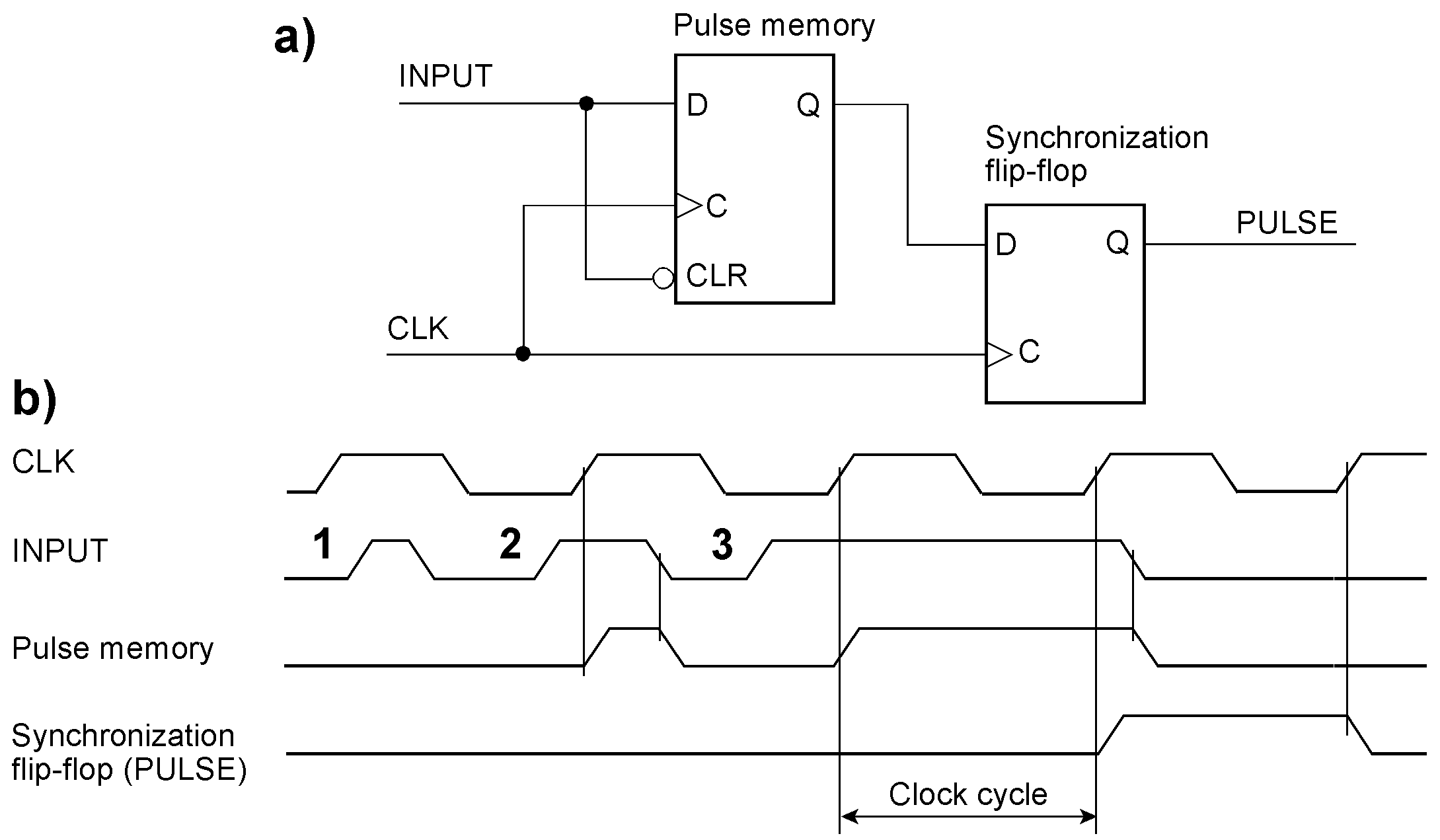 The arriving pulses are sampled and synchronized. Here, a two-stage synchronizer is shown. The application problem can be solved by state machine design as taught in the textbooks and supported by hardware description languages (HDLs) and integrated development systems.