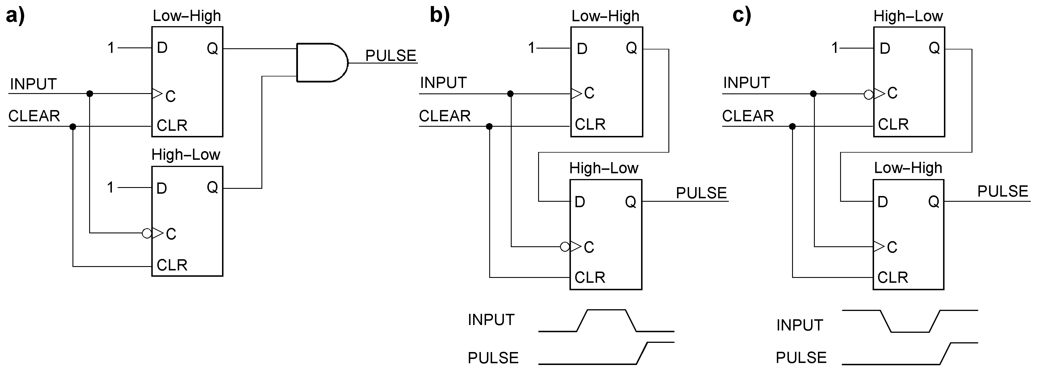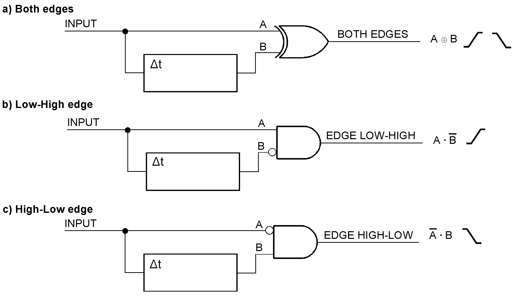 The circuit (a) detects both edges regardless of how they follow each other. The circuits (b) and (c) detect pulses beginning with a Low-to-High or High-to-Low edge, respectively.