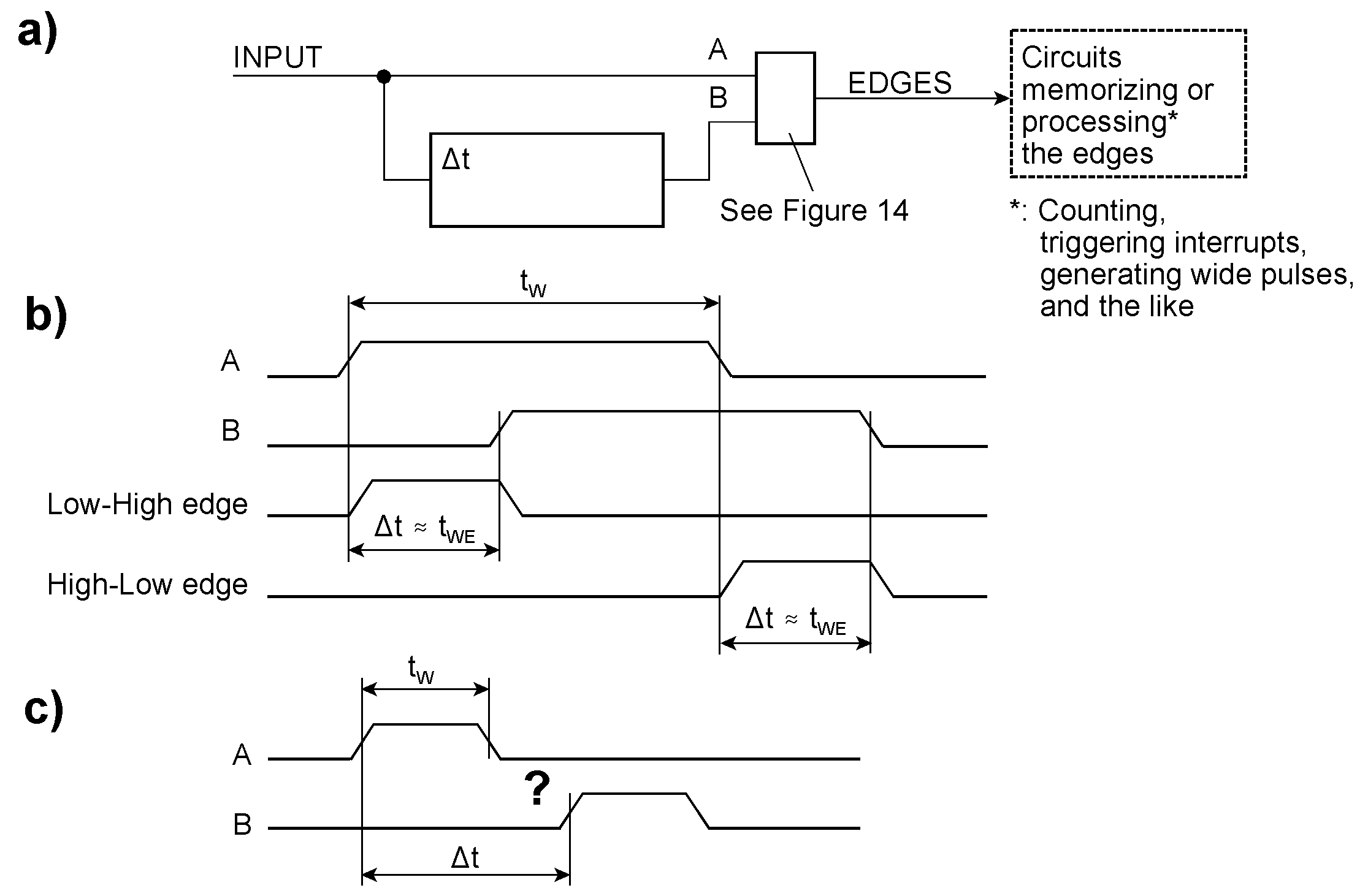 An alternative approach is to delay the signal and compare the delayed level with the current one). The limiting parameters are the minimum pulse width tW in the pulse train and the minimum pulse width tWE that the edge detector circuits expect. tWE approximately equals the delay time Δt. The delay must be shorter than the pulse ( Δt < tW); otherwise, the circuit will not work.