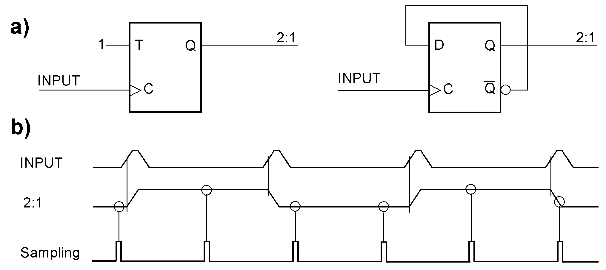 An alternative approach for dealing with narrow pulses is to stretch them, that is, to make them wider instead of memorizing them. A toggle flip-flop converts arbitrarily wide and even extremely narrow pulses to symmetric pulses that retain their level until the next input pulse arrives. Basically, it is a 2:1 frequency division. (a) shows a genuine T flip-flop and a D flip-flop turned into such. As shown in (b), narrow pulses are converted into symmetrical wide pulses that can be sampled reliably