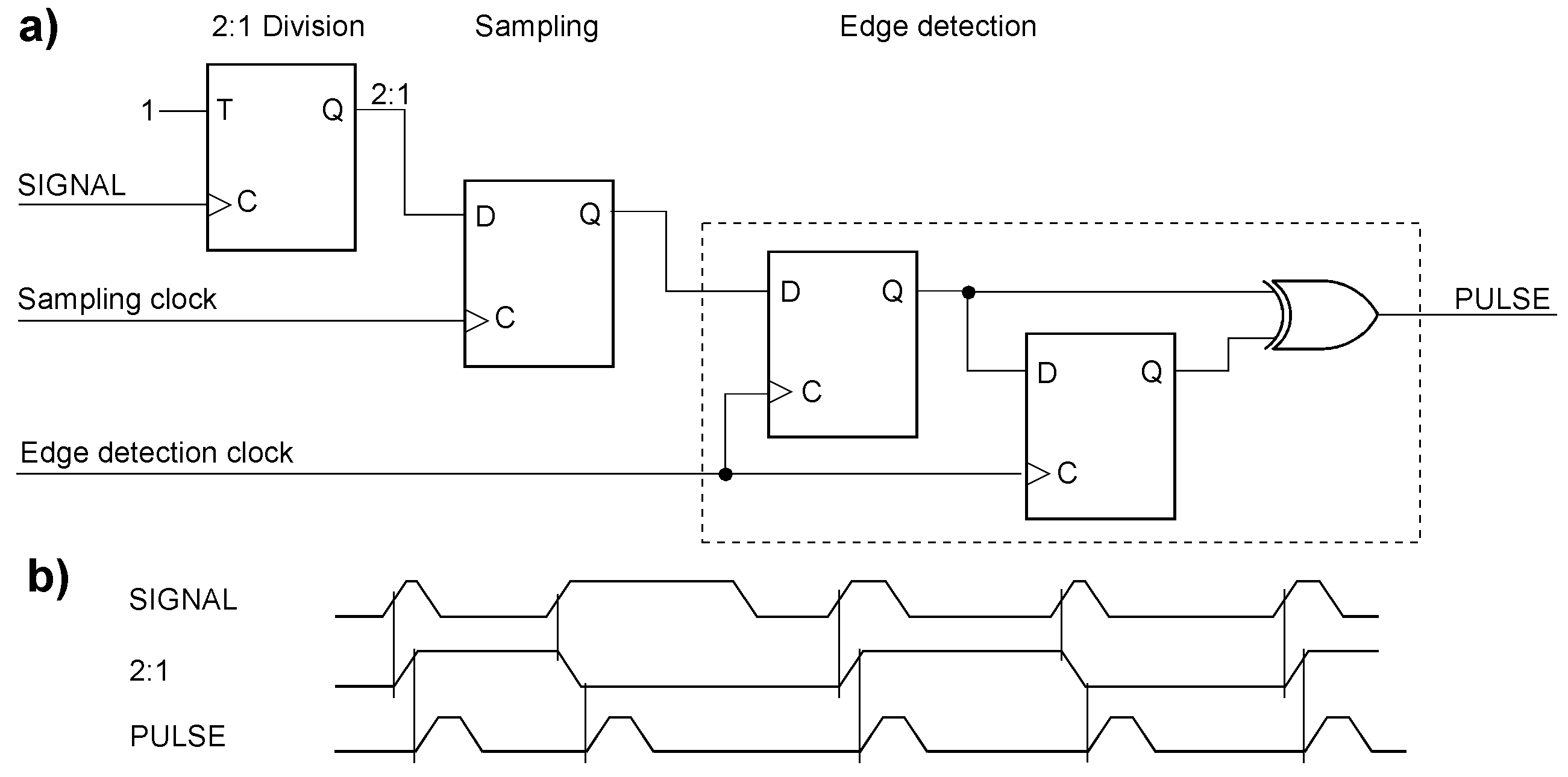 Each edge of the 2:1 pulse train signals an original pulse. Hence, the original pulse train can be reconstructed by detecting both edges. Here, it is done by a synchronous edge detector (a). Its clock determines the width of the output pulses. The delay must be shorter than the narrowest pulse. Therefore, the edge detection clock frequency must be higher than the sampling clock frequency. To ensure this, the sampling clock could be, for example, derived from the edge detector’s clock by frequency division. (b) shows example waveforms. A practical application example is crossing clock domains. The SIGNAL comes from another clock domain. This pulse train is injected into the target clock domain, to which the sampling and edge detection clocks belong.