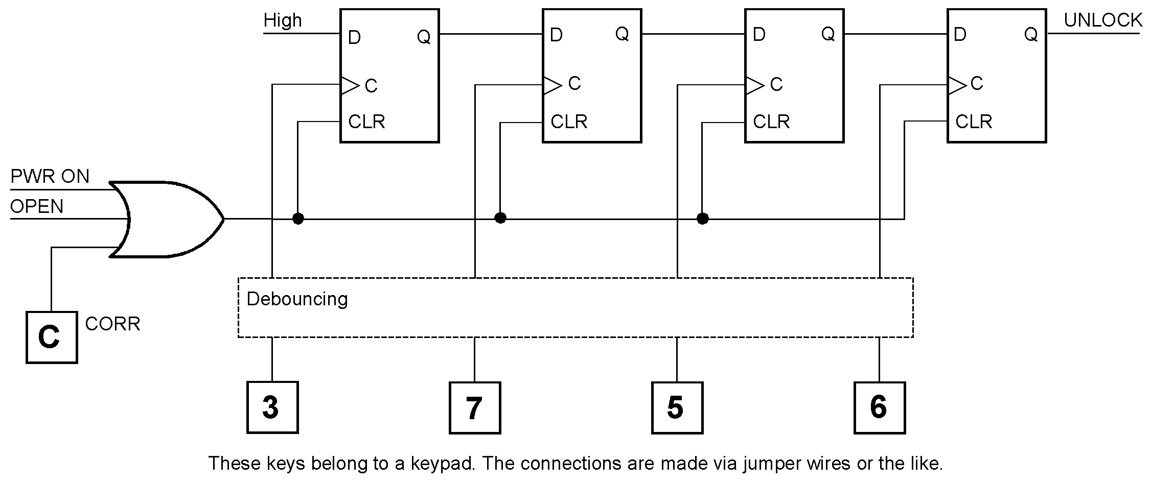 Sequence detection shown by the example of a straightforward code lock. The UNLOCK signal actuates the door opener. The flip-flops are cleared during power-on, when the door has been opened, or when the CORR key is depressed. The number keys are part of a keypad (with the keys 0...9; arrangement similar to a telephone or calculator). The key signals must be bounce-free. For the UNLOCK output signal to become active, the number keys 3, 7, 5, and 6 must be pressed in precisely this order. If the door has been opened, the OPEN signal activated by a door contact resets the code lock.