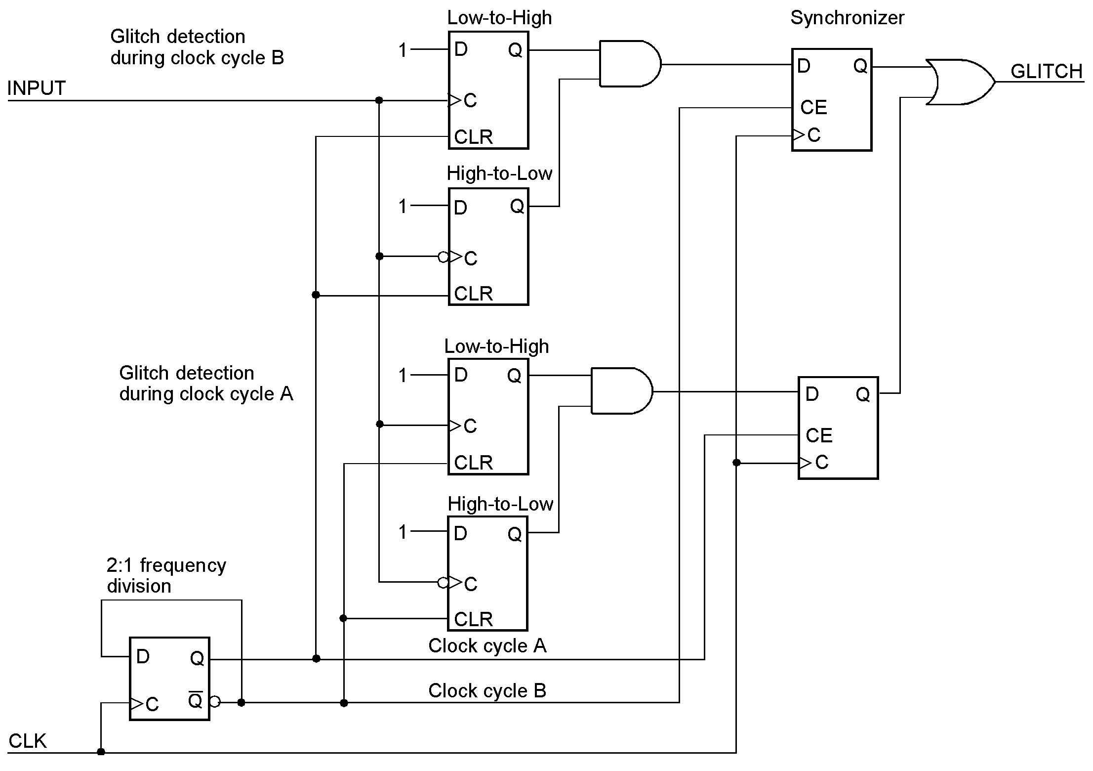 The following circuits are based on principles of synchronous operation to suppress or detect glitches. Essentially, they are finite state machines (FSMs). Hence, their operation can be described by state transition diagrams.